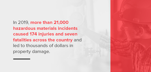 Hazardous materials are those that could present risks to human health or the environment. Historically, hazmat spills have caused health issues, injuries and death in both humans and animals. They have also damaged homes and properties and contaminated local environments. In 2019, more than 21,000 hazardous materials incidents caused 174 injuries and seven fatalities across the country and led to thousands of dollars in property damage.