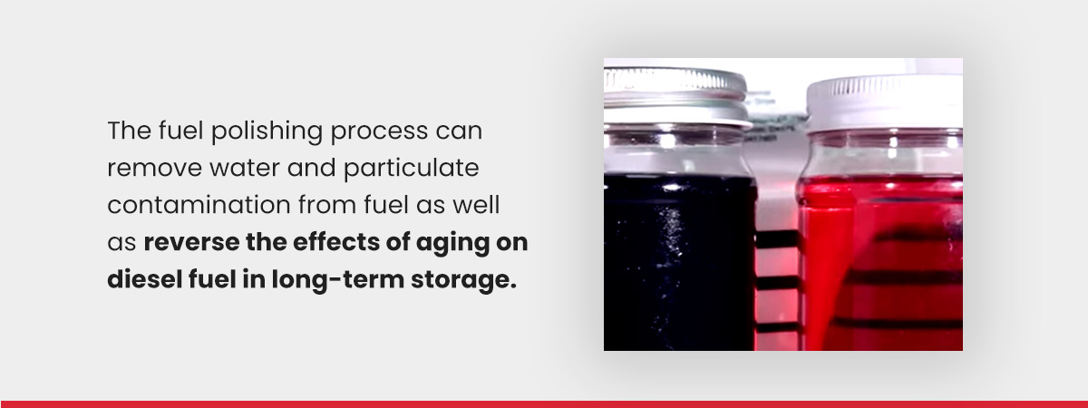 Fuel polishing has numerous benefits for your operation. The fuel polishing process can remove water and particulate contamination from fuel as well as reverse the effects of aging on diesel fuel in long-term storage. For facilities with zero tolerance for downtime, Foster Fuels recommends that polishing be planned for every third year as preventative maintenance.